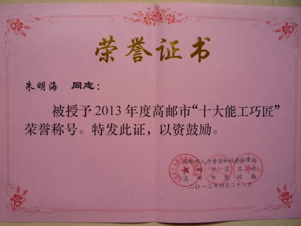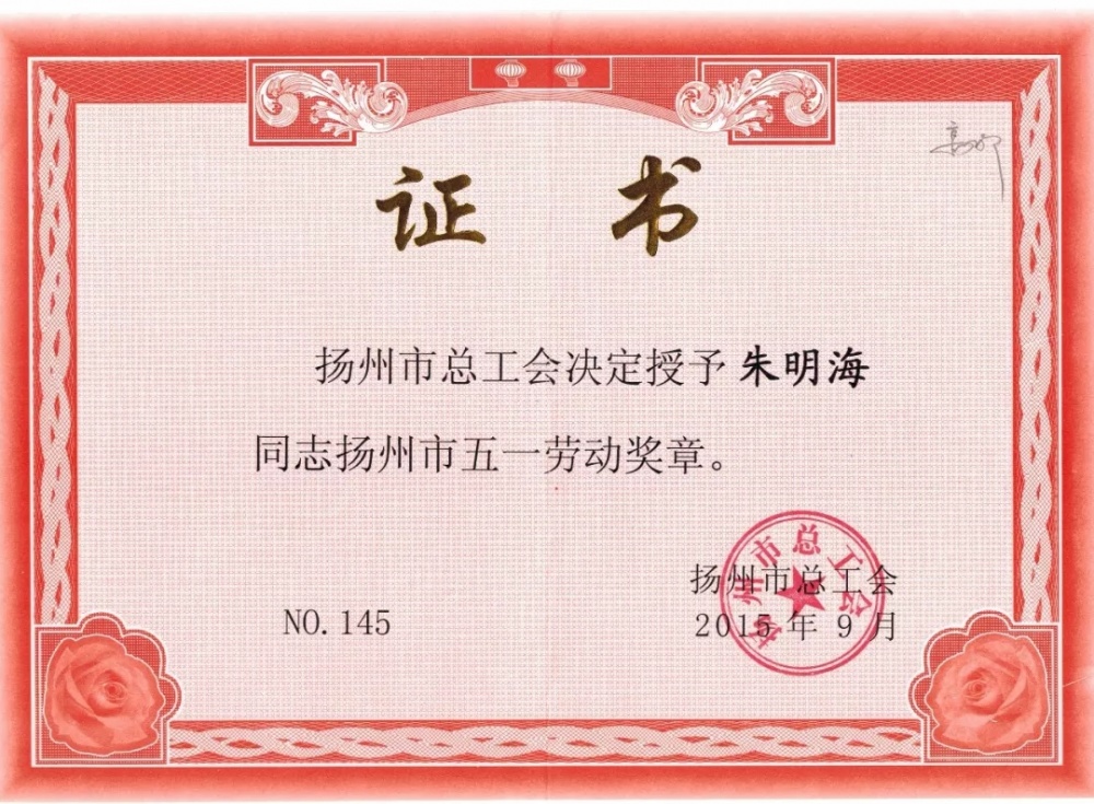 近年來,朱明海先后獲得高級(jí)工程師、高級(jí)經(jīng)濟(jì)師職稱;揚(yáng)州市五一勞動(dòng)獎(jiǎng)?wù)?、揚(yáng)州英才培育對(duì)象、高郵市十大能工巧匠等榮譽(yù)稱號(hào)。