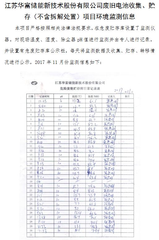江蘇華富儲能新技術(shù)股份有限公司廢舊電池收集、貯存(不含拆解處置)項目環(huán)境監(jiān)測信息