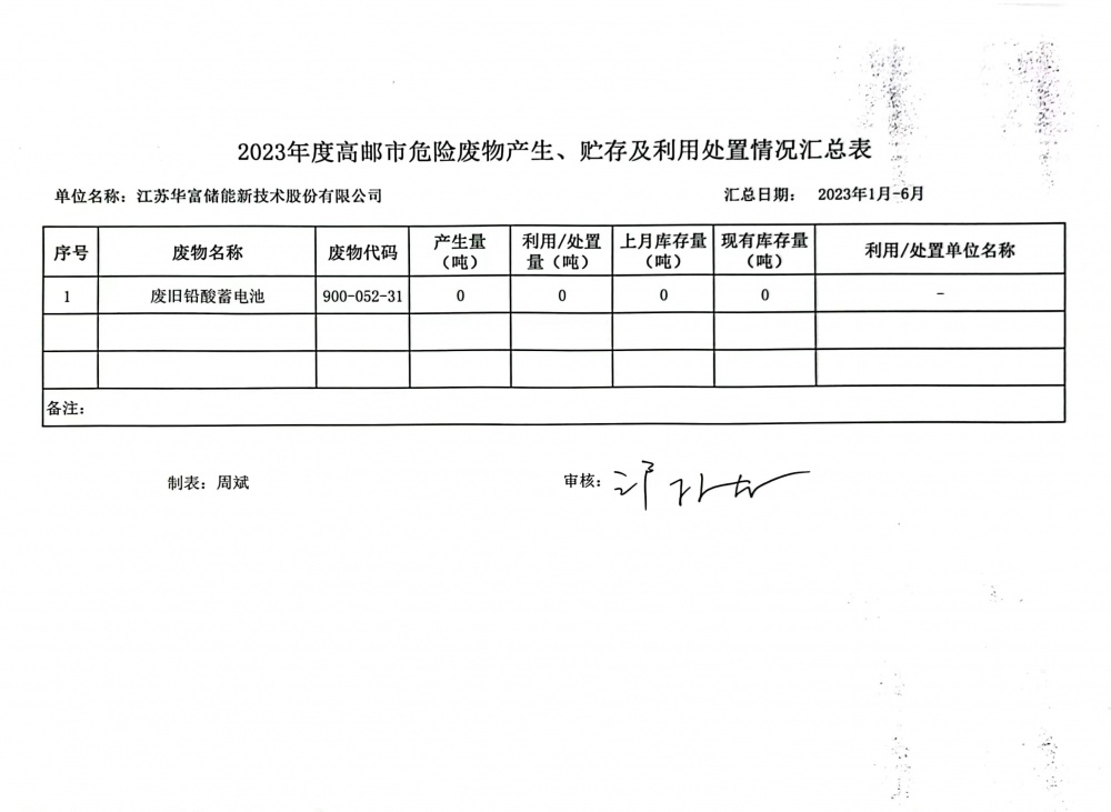 關(guān)于華富儲能2023年上半年危險廢物經(jīng)營信息公示